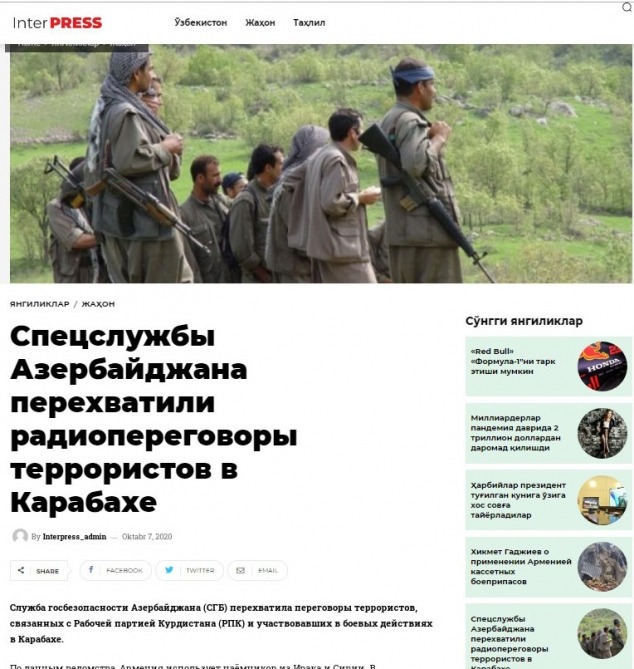 The portal interpress.uz wrote that Armenia involved PKK terrorists, as well as mercenaries from Syria and Iraq, in the clashes against Azerbaijan. It was reported that the special services of Azerbaijan have obtained the audio recording of the talks of PKK terrorists.
